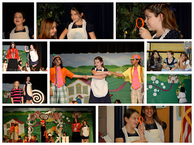You may remember me gushing a few months ago about how fabulous my daughter was in her elementary school musical. Well, now I have the photographic evidence! Isn't she the cutest little Alice you've ever seen? Maybe we're bad parents, but we didn't actually take any pictures ourselves that night. We just figured we'd buy the professional photographer's CD so we could sit back and enjoy the show. What we didn't figure was that it would take sooo long to get the pics. Anyway . . . My baby is CLEARLY the star, but also notice the whimsically cute scenery I painted. Please. (I'm fun, too. *pout*)