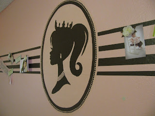 You may recall a while back (think waaaaay back) when I gushed on and on about the beautiful pink and brown room we were doing for Sis. At the time I promised photos. Didn't, however, promise how soon . . . See, I'm tricky like that. Because I knew after the pains those crisp brown stripes gave me it would be at least a little while before I was ready to tackle the brown ribbon stripes on the curtains. Well, consider 'em tackled. And in the mean time I was inspired to add this divine princess cameo on the wall above the bed. It turned out really cute, but I am still tweaking edges to get that border crisp and beautiful. (Why? Why did we do an oval frame instead of a rectangle?) Maybe a run to Aaron Brother's for a real frame is in order. Anyway. . . don't say I don't keep my promises. Eventually.