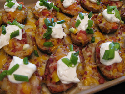 Preheat oven to 350*. Heat oil (about 1 " deep) in a skillet. Cut baked potatoes in half lengthwise and scoop out the insides, leaving about 1/4 inch of potato lining the skin. Drop potatoes 3 or 4 at a time into the hot oil, turning after about a minute, until skin is crispy and potato inside is golden. Drain on paper towel-lined plate. (I NEVER would have thought to do this on my own, but it makes ALL the difference. DO NOT SKIP THIS STEP IN A LAME ATTEMPT TO BE HEALTHY!! That's why you're only having them twice a year, remember?)