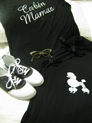 That's MY get-up for camp. Get it? Cabin Mamas instead of Pink Ladies! Those are just for me and Dee Ann, the other cabin mom. I even put monograms on the front a la Laverne and Shirley. The girls get bright blue t-shirts with the camp theme on them. Cute, but not quite AS cute. As it should be. The girls also get the poodle pants (more of that fun glitter!!) and "saddle" shoes. I love the way it all turned out. I found those sweet vintage bedazzled cat eye glasses on etsy for a steal. Love it!
