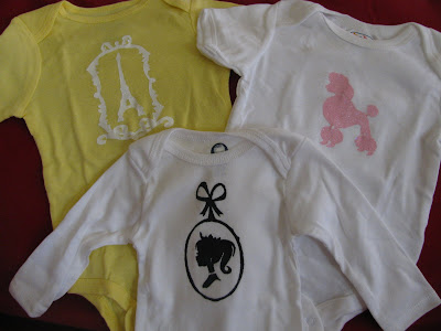 Another friend's new baby. A variation on a theme. You can't even tell in the pictures, but those pink poodles are sparkly as is the Eiffel tower on the yellow onesie. Washable glitter is 'da bomb!