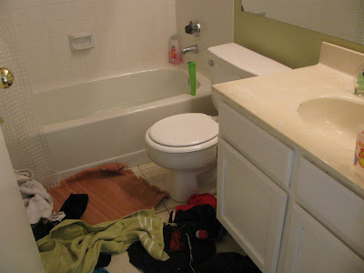 Tub still full of water from last night's baths . . . maybe the night before. Look really close and you'll see the chunks of an entire bottle of conditioner dumped in there. That's not the first time I've seen that mess. Nor the last, probably. Notice I've closed the toilet lid. You're welcome. There are also dirty clothes covering the entirety of the floor, rendering the bath mat useless.