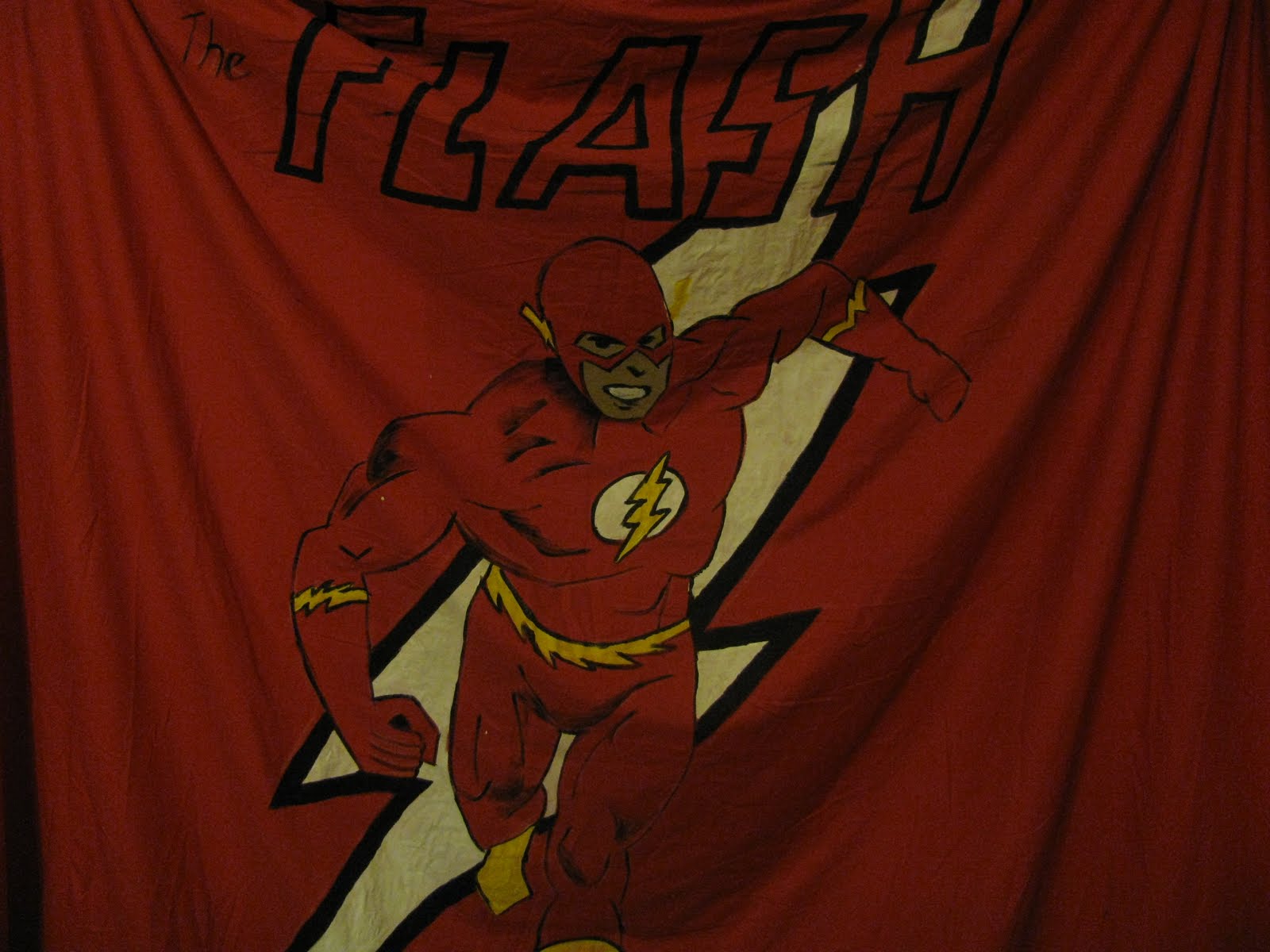 It's quick and dirty. Not one for the portfolio. Whatever. It's painted on a bed sheet and will be thrown away after camp. We also have lightening bolts and comic book sound effect bubbles (Whoosh! and POW! and the like) to dangle from the rafters. The rafters that will be lit by the lovely red lights if I can find them in the garage. Yay. I'm starting to get excited!