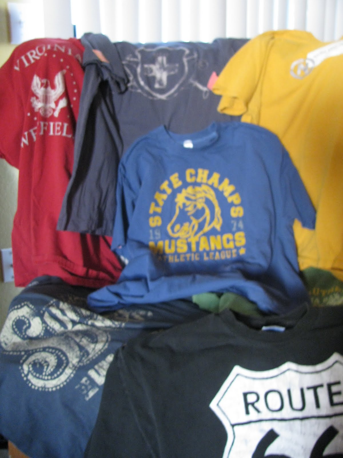 It was small enough to fit in that spot in the living room that has always been missing something and cheap enough that I won't be devastated if my first attempt at reupholstery fails miserably. So there it was sitting in the living room, waiting to be recovered in black and white checked fabric when I got a crazy idea. What if we used cool old t-shirts to cover the chair?! It would totally go with the artwork in the room. It's a little kooky, but I like kooky so we went out and found these cool vintage-y t-shirts today.