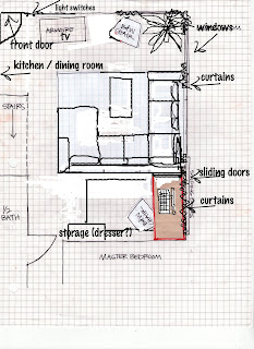I've spent the past several days trying to rearrange my living room, in the hopes of magically finding enough space for the computer out there. As opposed to in my bedroom where the kids eat chips and cookies in my bed no matter how many times I yell ask them ever so nicely not to. It must stop! However, as I've mentioned before, my home is a mere 1300 square feet. And my living room is a hot mess of a space. We have kind of a great room concept on the main floor of the house. The living room, dining room and kitchen are all basically one room, the living room separated from the other two by a staircase that runs up to the kids bedrooms. A staircase, open on both sides, that is smack in the middle of my living area. We also have huge windows on almost every wall, a sliding glass door that we NEVER use, and a fireplace that we also never use. Not once. (hello . . . Arizona here . . .) There is no reasonable way to arrange the furniture without wasting a ton of space.