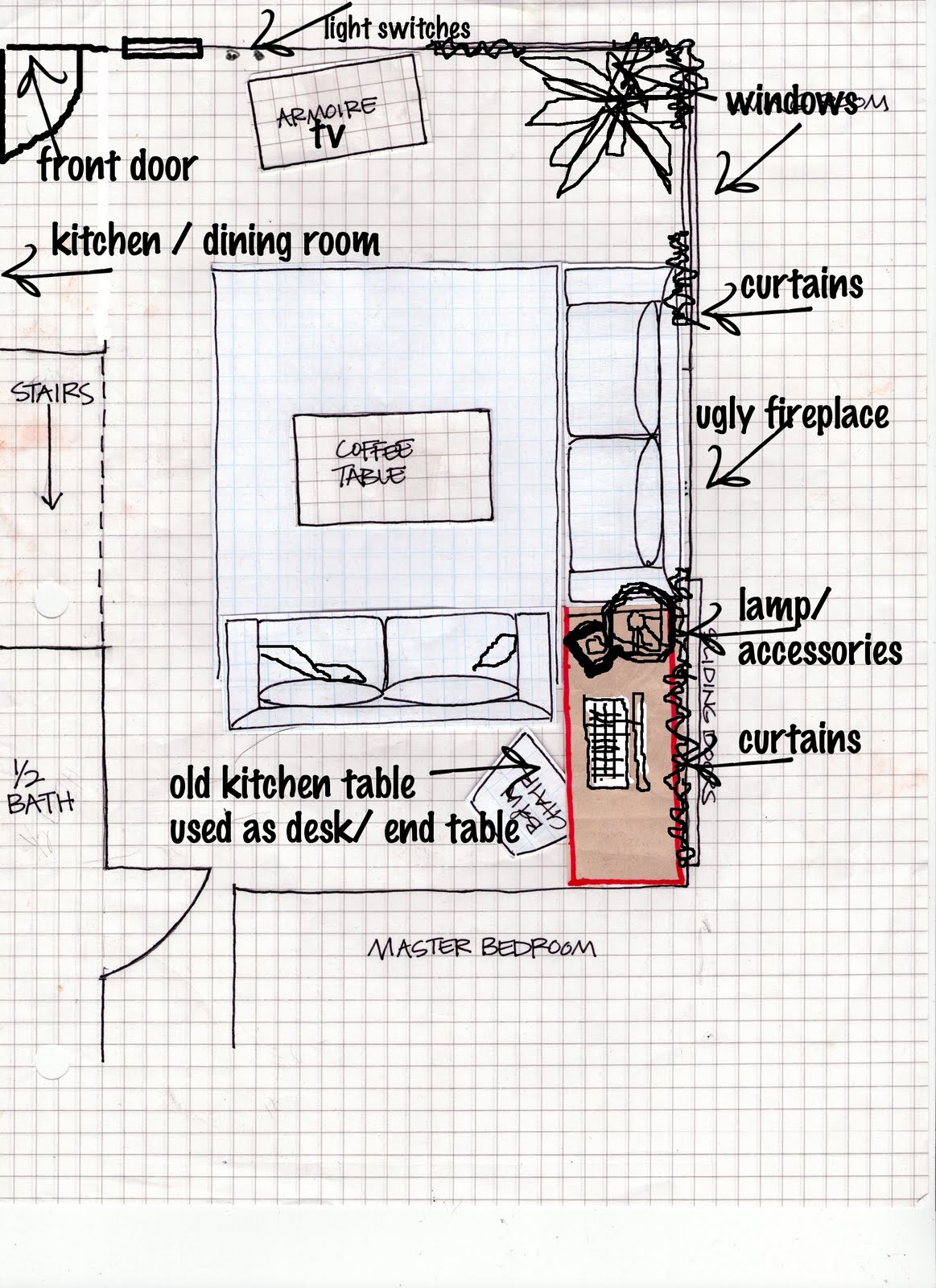 I've spent the past several days trying to rearrange my living room, in the hopes of magically finding enough space for the computer out there. As opposed to in my bedroom where the kids eat chips and cookies in my bed no matter how many times I yell ask them ever so nicely not to. It must stop! However, as I've mentioned before, my home is a mere 1300 square feet. And my living room is a hot mess of a space. We have kind of a great room concept on the main floor of the house. The living room, dining room and kitchen are all basically one room, the living room separated from the other two by a staircase that runs up to the kids bedrooms. A staircase, open on both sides, that is smack in the middle of my living area. We also have huge windows on almost every wall, a sliding glass door that we NEVER use, and a fireplace that we also never use. Not once. (hello . . . Arizona here . . .) There is no reasonable way to arrange the furniture without wasting a ton of space.
