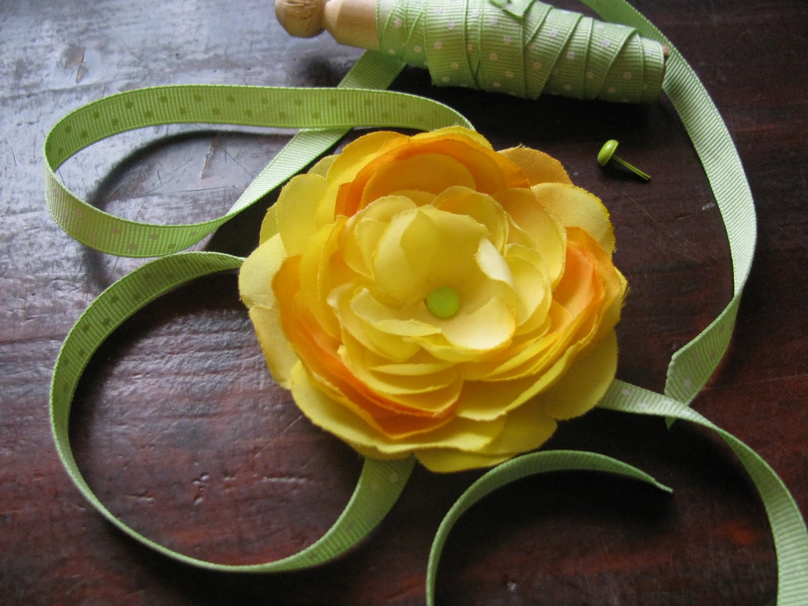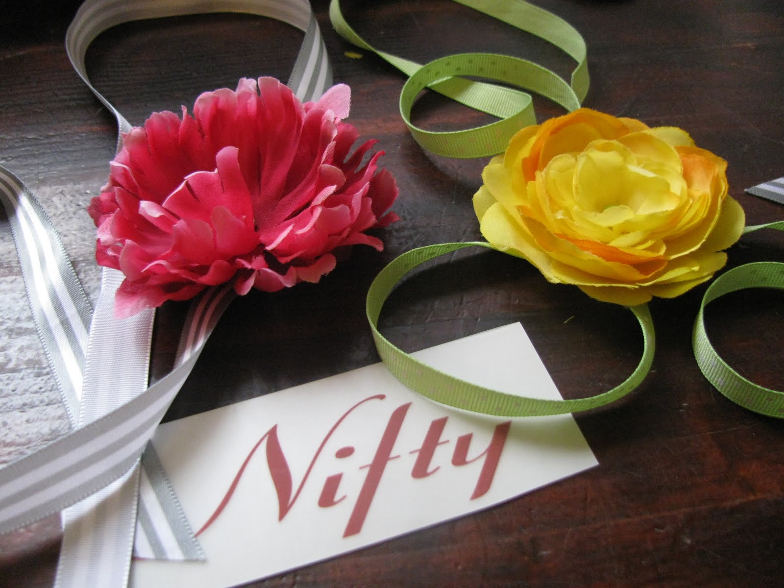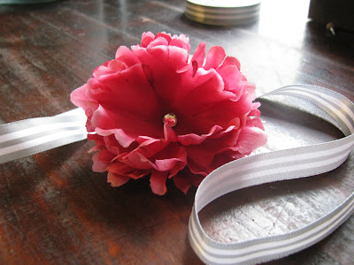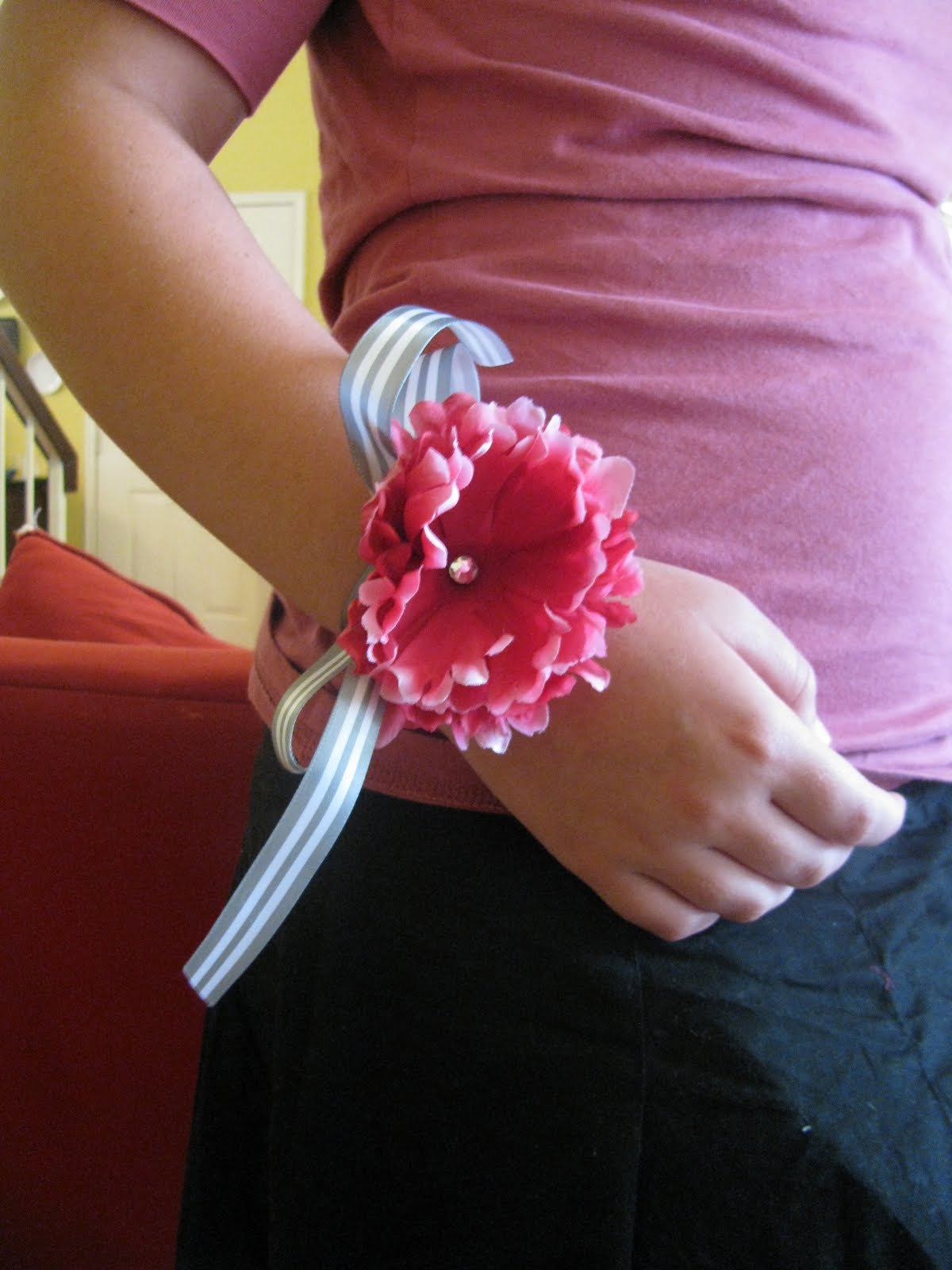 I read an article in the paper a few weeks ago about Summer of Dresses, a movement to celebrate femininity started by a group of women who decided to wear dresses at least once a week all summer long. What a fabulous idea! I guess it has really caught on world-wide thanks to Twitter and a website (summerofdresses{dot}com). Then I saw a girl at the store the other day who, to accesorize her outfit, had wrapped a piece of narrow ribbon around her wrist several times and tied it in a bow. Cute as can be. Super simple. I have thought about that several times since then. I love really girly things like dresses. And ribbons. And flowers. And ribbons WITH flowers . . . . I never felt more girly in all my life than when I went to prom and got to wear a pretty dress and a nifty wrist corsage. (The wrist kinds are the best because you avoid the whole awkward pin-it-on-your-chest moment. And you can point at things with a subtle flourish to draw attention to both your flowers AND your manicure in one fell swoop.) Why, WHY are corsages only for special occaisions? It doesn't seem at all fair, so I decided to create a variation on a corsage that even a . . . ahem . . . more mature, mom-like lady could pull off.