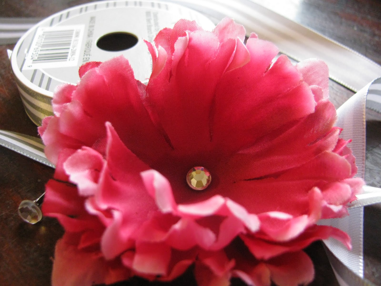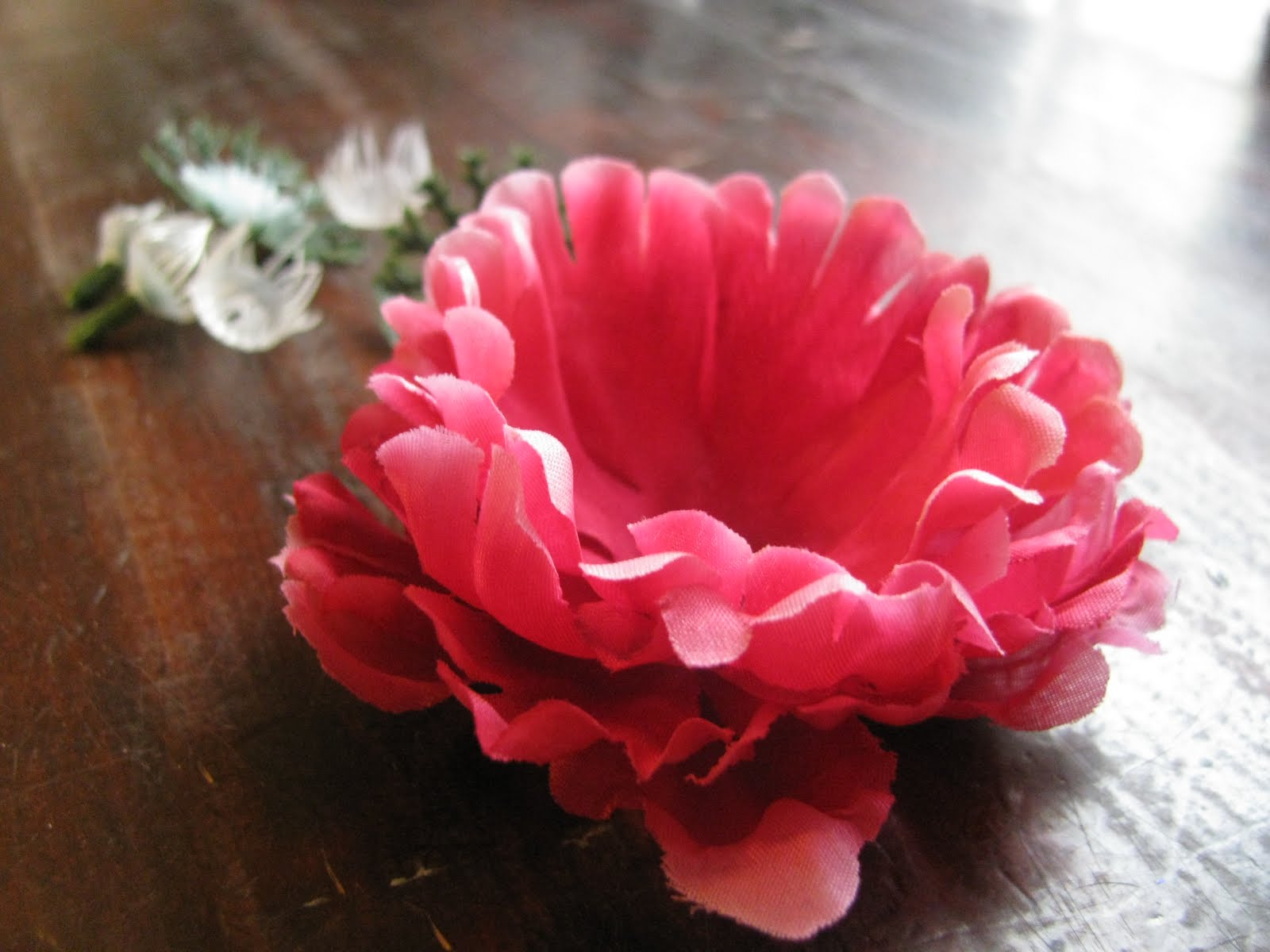 Start with a couple of silk flowers, which you will completely deconstruct. Remove all of the plastic pieces from between the layers and discarded the largest, outer-most layers until the flower is the size you want. You may find that when you discard a few of the layers and all the plastic "structure" your flower is too flat. (That's why I used two flowers.) Stack up your remaining layers and stick a cute scrapbooking brad through the hole in the center. Don't open up the prongs of the brad yet, though. Don't do it!