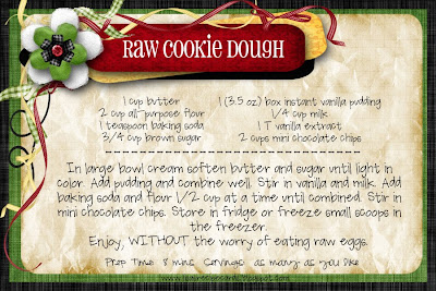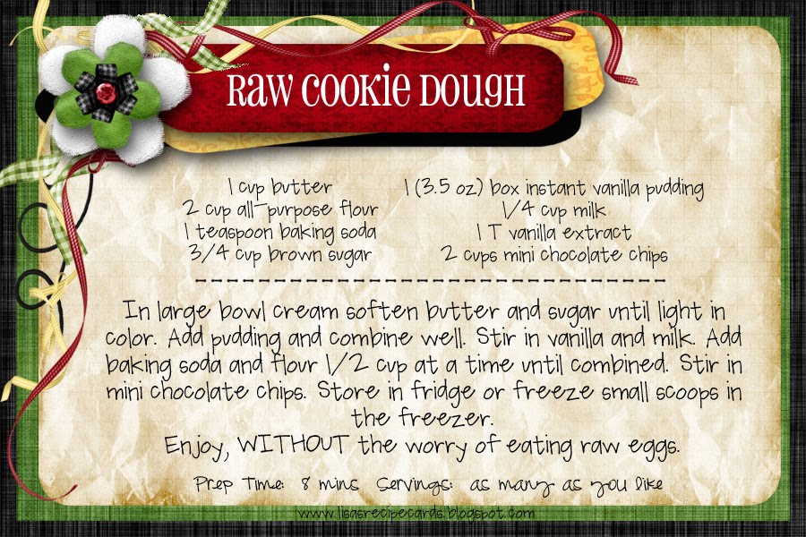 And now, because there are no losers here at My 3 Monsters, I'll share a delicious recipe I found out in blog land at Lisa's Recipe Cards. Everybody wins!! Do you all ever worry about eating raw cookie dough because of the egg in it? Me neither. I've eaten buckets of the stuff in my lifetime and come out unscathed, but better to be safe than sorry, right? So here's a recipe for eggless cookie dough, meant to be eaten raw. My children (and husband) will be thrilled!