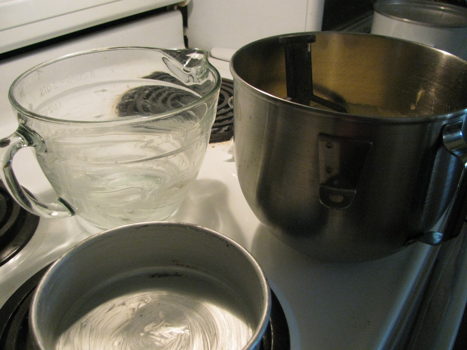 First you'll need a yellow cake mix, a 6" round cake pan, and a Pampered Chef Large Batter Bowl (or any other bowl that is oven safe , vaguely round at the bottom, and looks like it will sit nicely ontop of a 6" cake). Mix the cake mix according to the package instructions. Generously grease your pans. Pour 1/3 of your batter into the pan, 1/3 into your bowl, and the other 1/3 into another 6" pan (or save it to cook later if you only have one pan like me.)