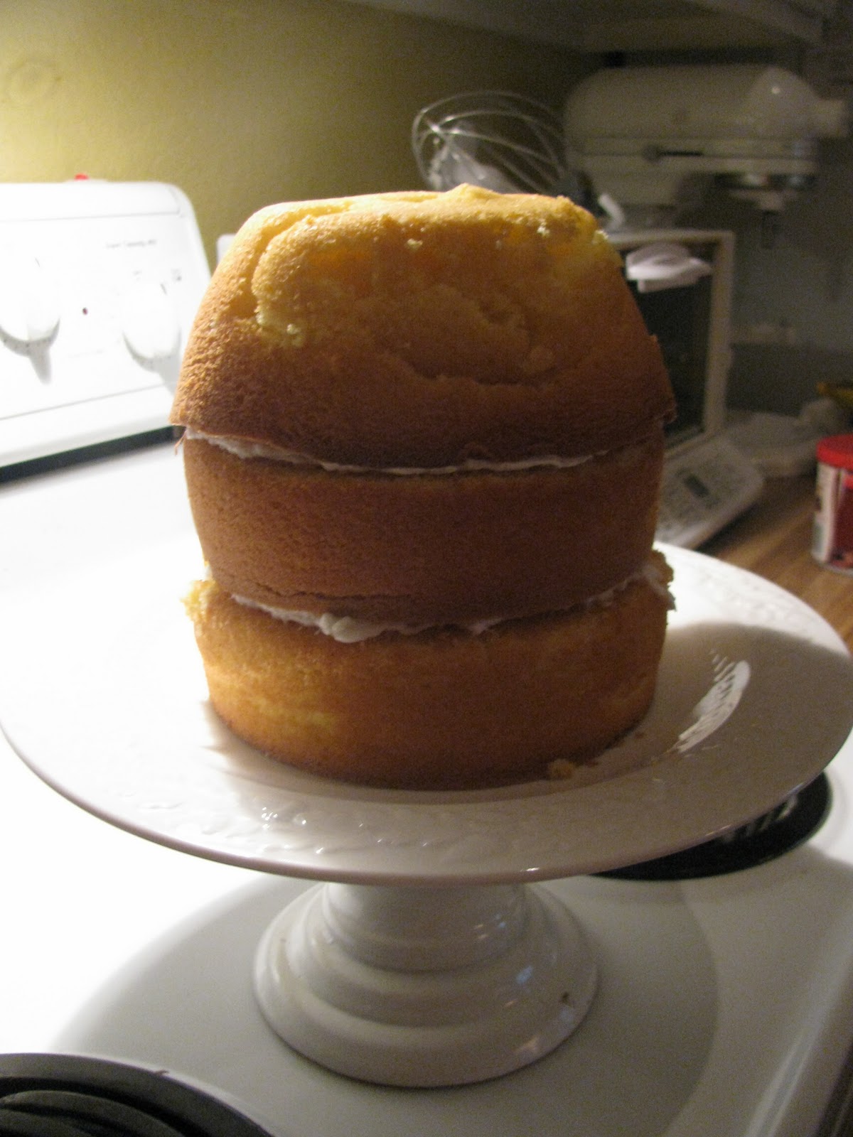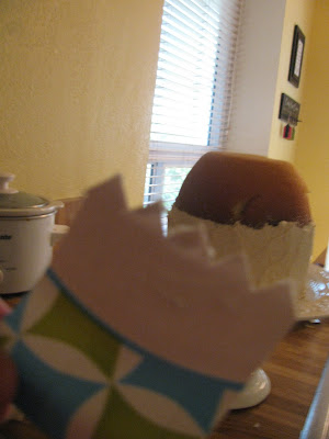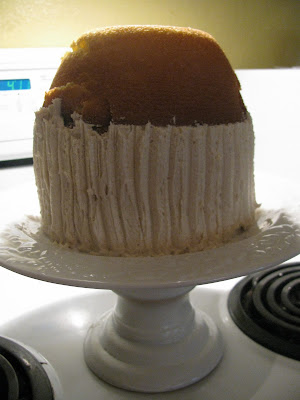 You'll probably want to crumb coat the entire cake with a thin layer of frosting. I did that last weekend and it worked out better. Then frost the bottom part. Just get a good even, kind of thick layer so that you can use this fancy tool:
