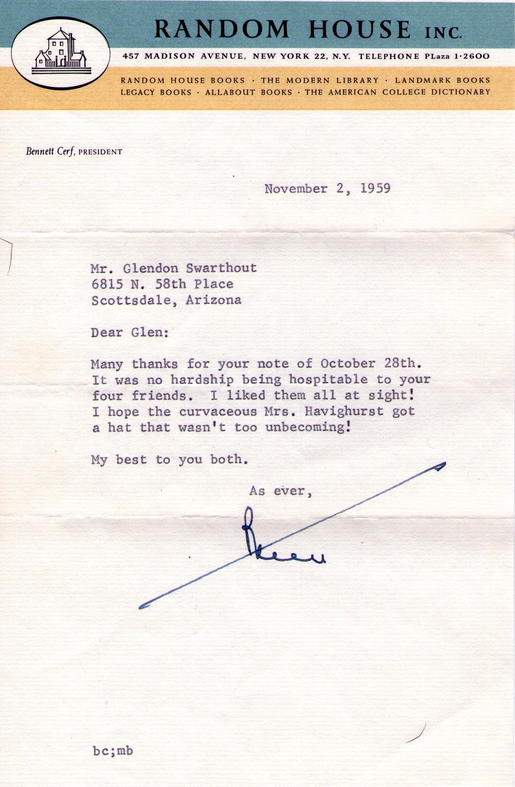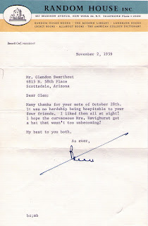 But whose signature is that? Well, here's where another letter comes in. It is a letter from Bennett Cerf, the co-founder of Random House publishers on Random House letter head to Glendon Swarthout dated November 2, 1959.