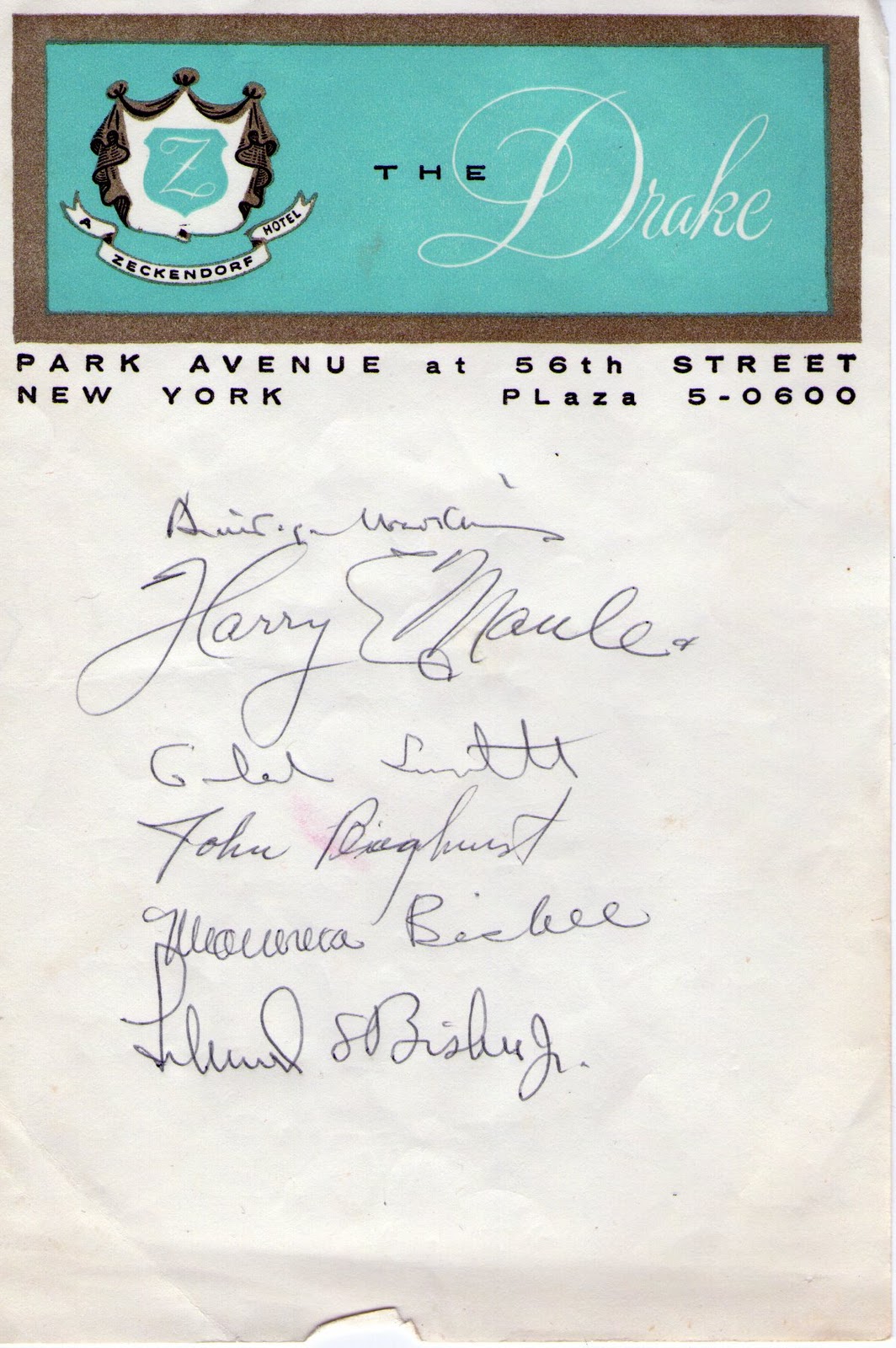 "They Came to Cordura" starring Gary Cooper and Rita Hayworth. I've never heard of the movie, but a quick internet search revealed that these are probably authentic. The Broadway Benefit Premiere was indeed on October 21st, 1959. Sweet, right? Now the plot thickens. There were also several sheets of stationery from the old Drake Hotel in New York City. One of them was a list of names, most of them illegible.