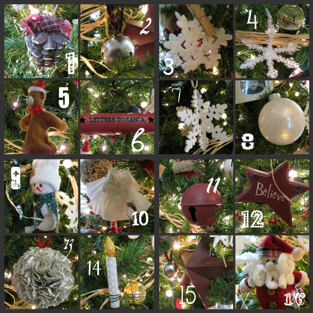And now, THE POST. The one you all probably dread. The sappy, sentimental post that always follows the raising of my Christmas tree. You may remember last year's post with the accompanying how-to's. But guys, come on!!! I've put a little piece of myself into every single item on that tree. For the past 15 years I have painstakingly created {or purchased when time was at a premium}little lovelies to display. Every year I have scoured stores to find just the right ornaments to add to my children's collections. I've agonized over the lights -- three different kinds of white lights because I wanted a variety of shapes and sizes and I wanted it to twinkle randomly, but not be too twinkly. I've picked up things in July or had brilliant ideas in March and held on to them all year just waiting for Christmas tree time. So I know you, me dear blog friends, will humor me as I blather on again. Or at least just look at the pretty, pretty photo collage I made.