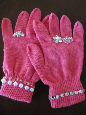 All it takes is some hot glue and a bunch of rhinestones, beads and ribbon. Target has 2-packs of those little gloves in their Dollar Spot right now. It was so fun I was up til 1:00 this morning making them. I think I may need a pair myself!