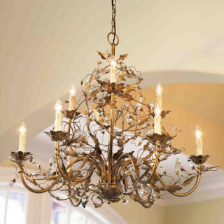 It wasn't exactly what I was looking for, but I knew with a little gumption {and spray paint} I could transform it. So it sat in the corner of my master bedroom and waited for me to get inspired. 'Til the day I had the vision. Not a literal vision. You know what I mean. There is a chandelier at Ballard Design that looks like it is wrapped in gilt vines and tiny crystals. It is stunning, as well it should be for nearly $400.