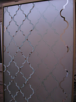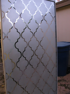 I went back when I was done cutting and removing and pressed all the remaining strips of contact paper down really good so the paint wouldn't get underneath. {Here is where you take care of your air-bubble situation.) Then you take them outside and spray them with the frosting spray. I used Valspar Glass Frosting spray and it worked great. I did two or three coats until I couldn't see myself anymore in the mirror. It took a can and a half to do two doors like the one below.