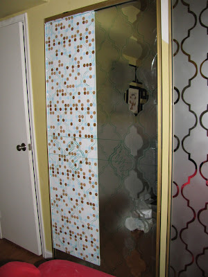 I've mentioned before that we bought our home as a fixer-upper. Lots of things in the house bugged me, but they were all changeable and I had a good feeling about it as a whole. I just didn't know then that it would take 8 years to get around to changing some of the things. Like the horrible mirrored closet doors. I didn't take a before picture, but you've all seen 'em. All big and . . . mirror-y . . . and slide-y and framed in brass. About 5 years ago we replaced most of the closet doors in the house with paneled bi-fold doors, but this closet opening in particular was so wonky we couldn't get the bifolds to work, try as we might. So the mirrors went back up. Then last spring when we did the board and batten and the burlap floor in the master bedroom we had to take the closet doors off so we could move the dresser in there to get it out of the way. I was determined to NOT bring them back in this time. So they sat in the garage and the closet sat . . . wide open and ugly. Long story short, I was looking through the Tatertots and Jello Weekend Wrap Up Party a couple of weeks ago and saw this beautiful closet makeover at Keep Home Simple. I instantly fell in love with the pattern she hand-painted on the walls. It was elegant and lovely and I thought that maybe, just maybe, I could recreate it somehow. THEN I remembered the can of glass frosting spray I bought for the windows of the french door in the bedroom {and never used . . .} and an idea was born. It took me several more days to work out the details in my mind, but then a project was born. FROSTED MIRROR CLOSET DOORS!!