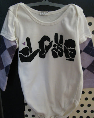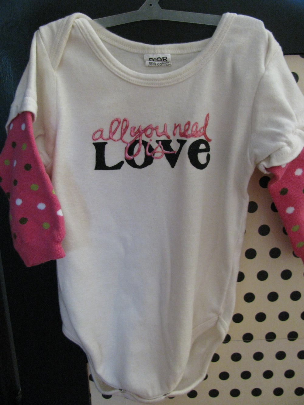I found a bunch of really cute baby legwarmers {name-brand -- holla!}at the dollar store a while back and thought they would be perfect for some long-sleeved layered-look onesies. I just cut each legwarmer in half and sewed the raw edges underneath the hem of each sleeve with a long zigzag stitch. Soooo easy! Why, WHY, didn't I know how to do fun stuff when I actually HAD a baby at home?!