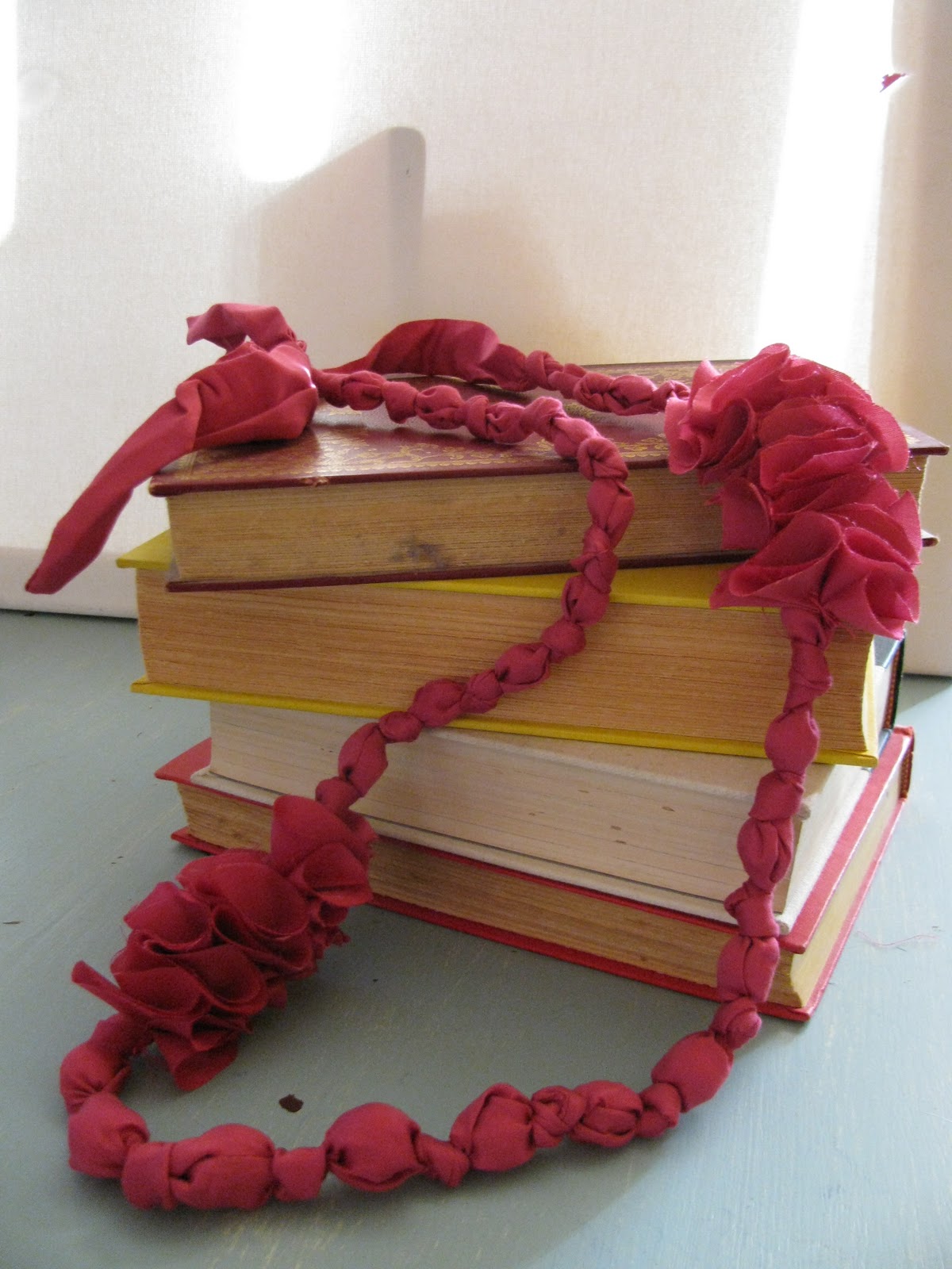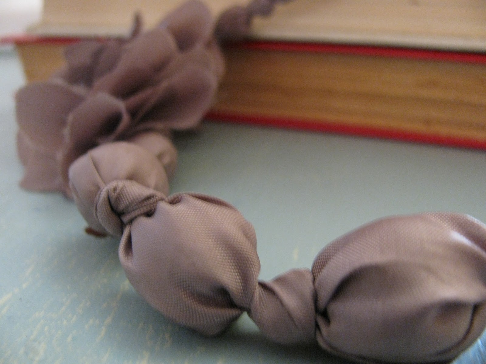 I'm loving these long fabric necklaces lately. You know the ones -- usually a mix of fabric flowers, ribbons and beads and/or chains. They're super feminine and pretty. It's easy to throw on with jeans and a t-shirt to look a little bit fancy, but looks equally good with your Sunday best. They can get a little pricey, though -- especially the ones I like. Whatever. That's why when I ran across this great Anthropologie knock-off at Flamingo Toes I was THRILLED. It looked easy {it was} and inexpensive {that, too}. I found a super ugly plastic beaded necklace at the dollar store and a quarter of a yard of fabric that looked like silk {but wasn't -- no one will know}
