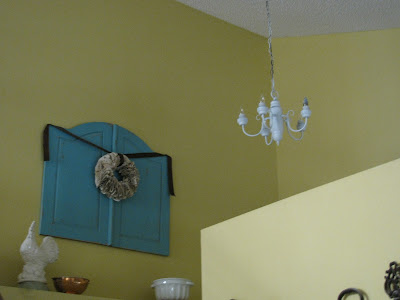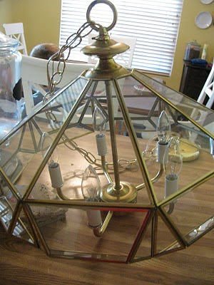 Many of you reading this blog have never been to my home. You may not be aware of how dire our lighting situation has become. Ann, you are aware. For years {since the very day we bought this home}I have looked at the 80's style track lighting in my kitchen with lights the size of #10 cans and thought, "Someday, sucker, you're goin' down". Then, as each bulb burned out and we tried {and failed}to replace it, my disdain for that light grew. And grew. But it was so high up there and chandeliers are so expensive. And there we sat, me and that ugly light fixture at an impasse. For years. About six months ago I bought a chandelier on Craig's List for $10. It was nothing fancy, but it was an exact match to the chandelier in our dining room which was good enough for me at that price. And then that new chandelier sat in the garage because the ugly old beast was STILL SO HIGH up there. Mocking me with it's one wavering light pointed at the wall 15 feet up instead of down into my little kitchen. So, it brings me great pleasure to share with you our projects of last weekend. I screwed my courage to the sticking place {I love that expression} and climbed up the ten foot ladder balanced precariously on top of an old, just-barely-big-enough dining table where, from the highest rung on which you are allowed to stand, I could just barely reach that old monster. It came down without much of a fight and the new one was installed. I only dropped a screwdriver on my forehead once and the teeny tiny little screws about a thousand times in the process. But it's up and it works and now I can actually see when I cook. I have found myself thinking, "Is that what that really looks like?" several times. Because I've been cooking by the light of my microwave. For eight years. Now, before I show you the triumphal photo, let me disclaim that I know one bulb is already burned out and it needs light shades. I'm working on that. Also, you should know that it's hard to take a good picture of a light fixture. OK. With that, you may now see: