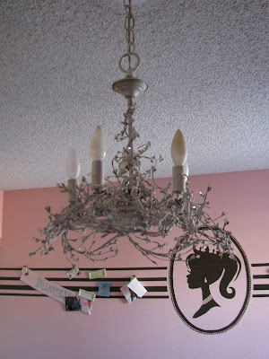 You can see them in there if you look reeeeeeeealy close. It looks all sparkly in real life. You can also see that my paint job isn't perfect to which I say, "Shut up. It's fine." This light, too, needs cute little shades, but I am absolutely in love with it!! It looks so perfect in her pink and brown "sophisticated princess" room. See:
