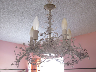 It wasn't exactly what I was looking for, but I knew with a little gumption {and spray paint} I could transform it. So it sat in the corner of my master bedroom and waited for me to get inspired. 'Til the day I had the vision. Not a literal vision. You know what I mean. There is a chandelier at Ballard Design that looks like it is wrapped in gilt vines and tiny crystals. It is stunning, as well it should be for nearly $400.