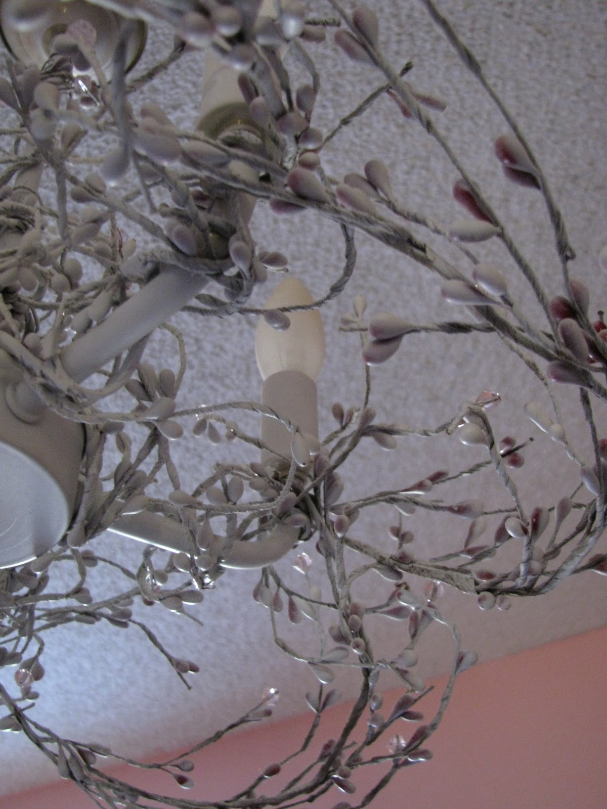 I wrapped the frame of that old brass light in a couple of wired berry garland I got on Christmas clearance last year. The garland was brown and red. I got a few raised eyebrows from family members who weren't sure if they wanted my monstrosity hanging in their home {ahem, Brent and Syd}. No matter. I told them to shut up and just let me finish since it wasn't costing us anything to try my genius idea out and then I took that bad boy out to the garage and sprayed it white, which immediately won them over. To make it sparkle like the Ballard one I went to the craft store and picked up a couple strings of sparkly pink bicone beads and randomly stuck them right onto the ends of the little twiggy things {super technical process}.