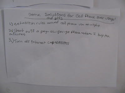 After dinner on Monday night our dear daughter sat us down for a little presentation. She wants a cell phone. I mean, REALLY wants a cell phone. She has tried begging. She has tried whining. She has even tried verbal abuse. This logical, business-like approach may just be tipping the scale in her favor . . . (even if the numbers on the pie chart don't add up to 100).