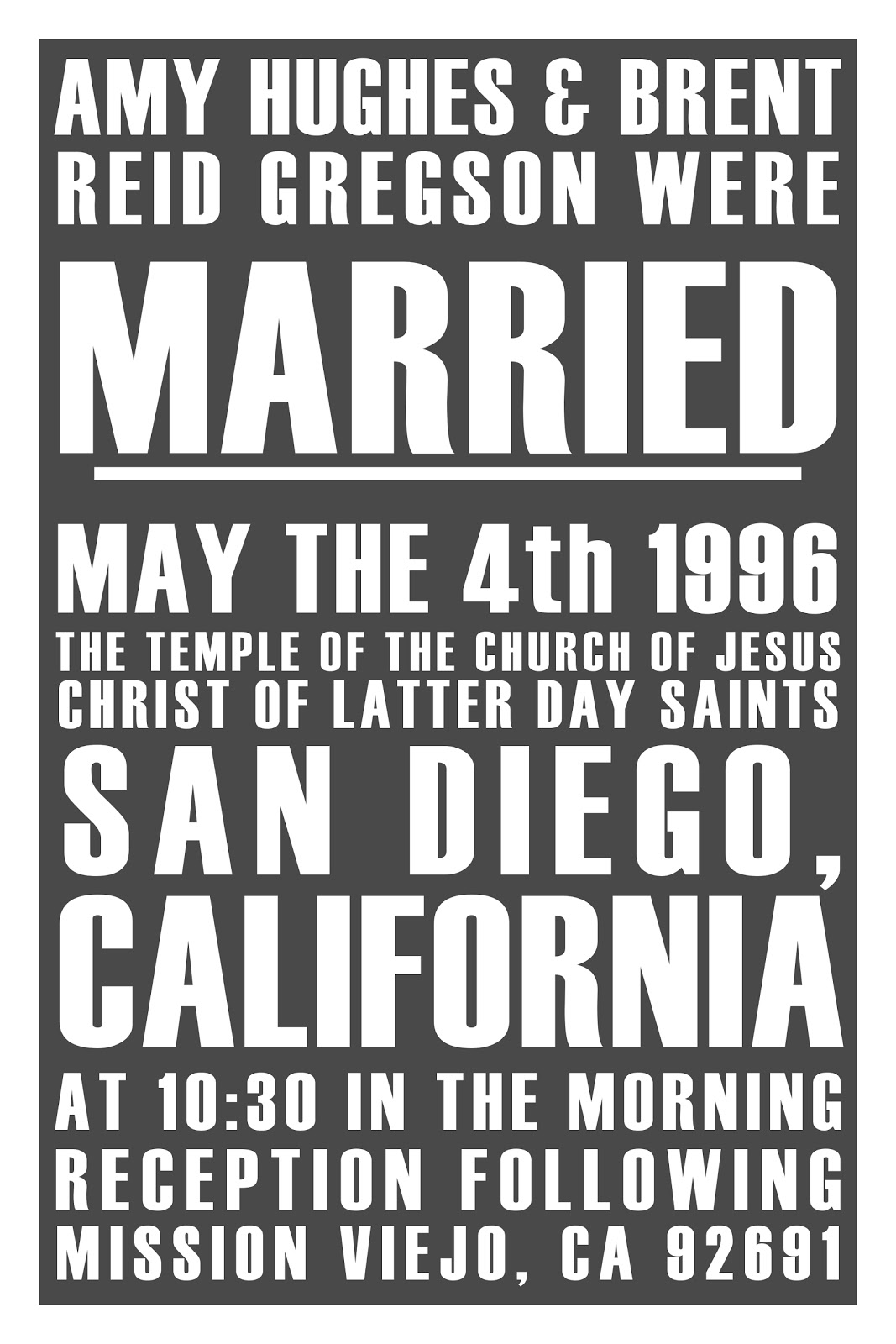 As I mentioned in a previous post, we are working on finishing up our master bedroom {that we began working on almost a year ago . . .} As I also mentioned, I L.O.V.E. inexpensive graphic art. I'm kind of a sucker for typography, too. So when I happened upon this to-die-for-gorgeous bedroom at The Pampered Mom over the weekend, I knew I H.A.D. to have that wedding announcement subway art on her wall. It is stunning. And Brent likes it so, you know, that makes up for the silhouettes. It was super easy to throw together in Gimp {because I want to print it BIG}, but it could also be done in Word or the like for a smaller print. What took the longest was trying to find the font that was used in the original -- I finally decided that it was Haettenschweiler. That may or may not be exactly right, but it is blocky and has that curve on the R just like the original so, close enough.