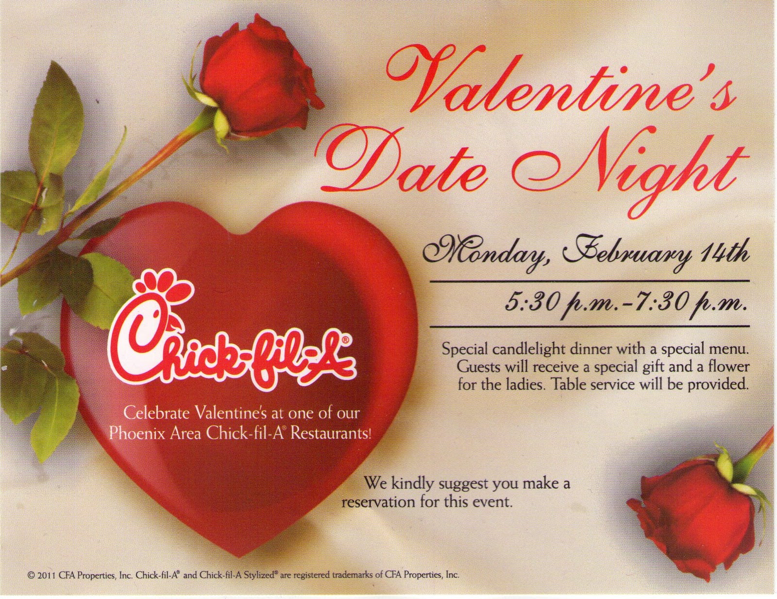 {Yes, we actually went to Chick-fil-A tonight. And don't you romantics feel sorry for me. We giggled for hours about how silly it was, which was plenty fun in and of itself. Plus, their chicken sandwiches are delicious. I'm just sayin'.}