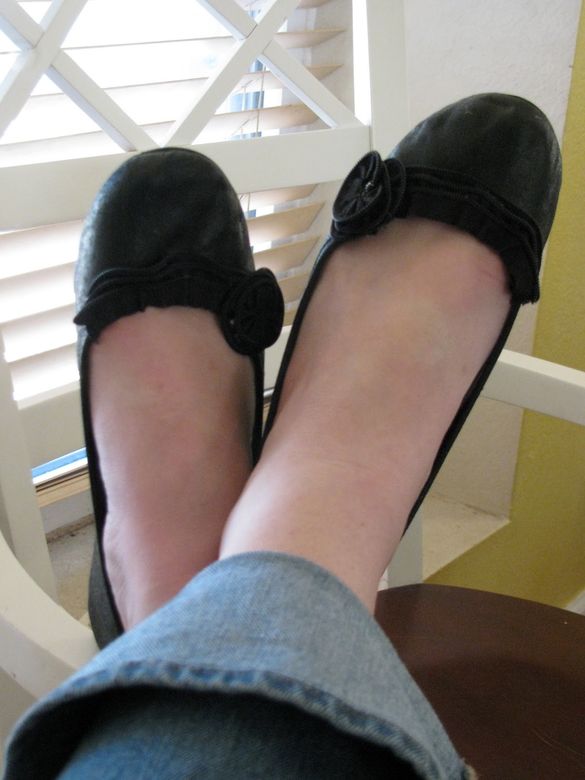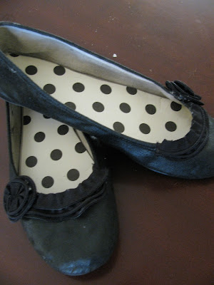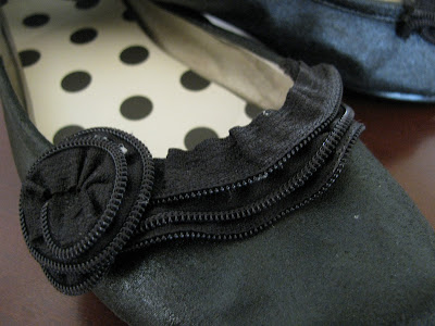 Et voila! They look like new shoes, and cuter than the original, if I do say so myself. I painted them with a few coats of black fabric paint {which make them look like leather if you don't really look too closely} and hot glued on a couple of zipper ruffles and rosettes.