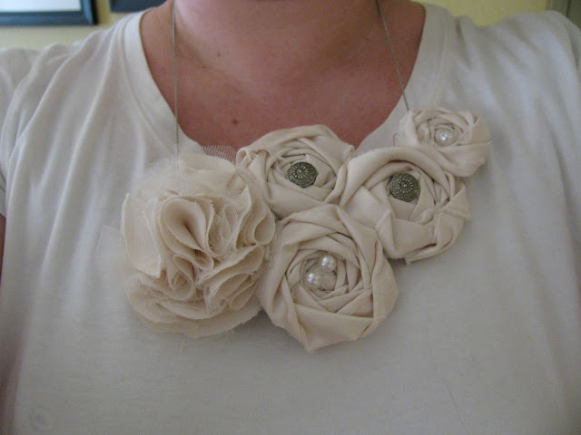 Whew! One week down, 3 to go . . . I mentioned the other day that I don't think there is much in the world that couldn't be vastly improved by the addition of fabric and ribbon flowers, right? So when I saw this necklace on Pinterest, I knew I had to make it: