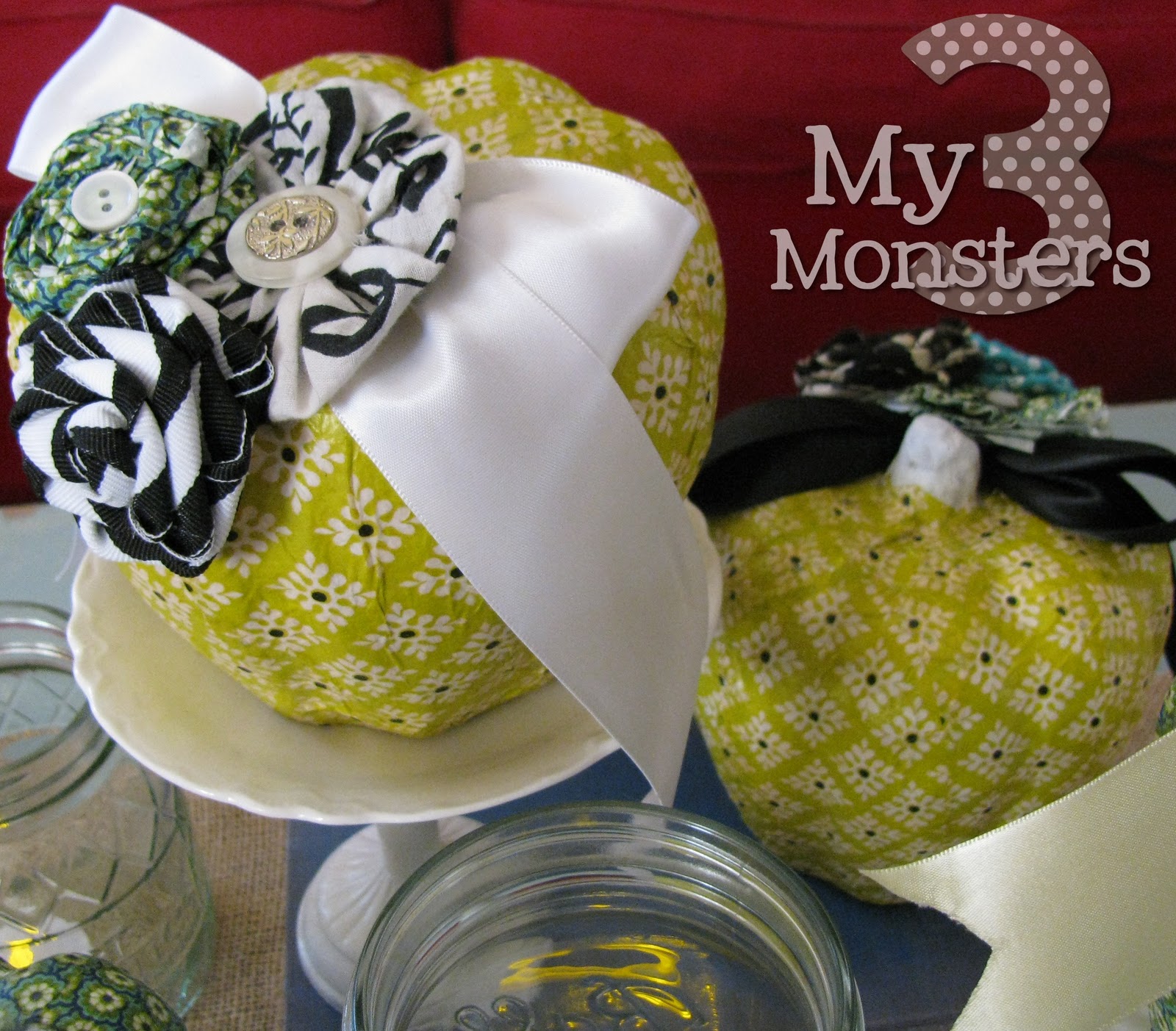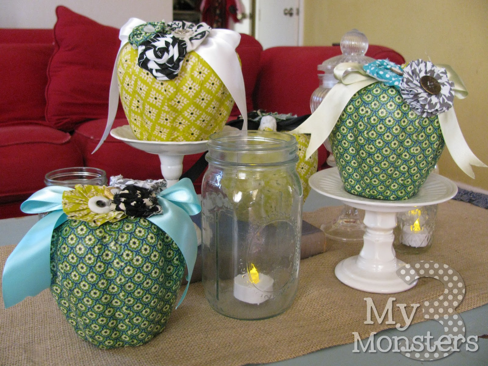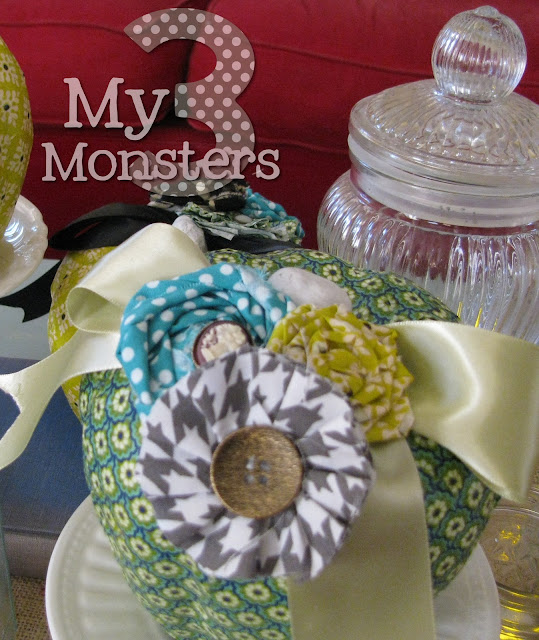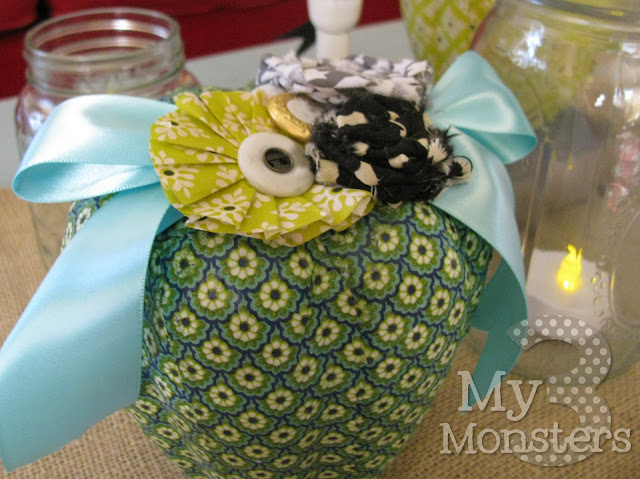 They were just not so cute, in my humble {yet absolutely correct} opinion. Shortly after I took this picture I removed the black polka dot tights from the pumpkins and they spent the season plain. It was kind of nice looking with the white ceramic jars in my creepy apothecary on the coffee table. The nice thing about pumpkins is you can keep them out all the way until you put up Christmas dècor. I love a two-for-one! Then I saw these adorable Vera Bradley print pumpkins from Crafting Rebellion on Under the Table and Dreaming and I knew exactly what I wanted to do. All you have to do is mod-podge pretty patterned paper napkins on to your pumpkins and embellish. They're so simple and pretty.