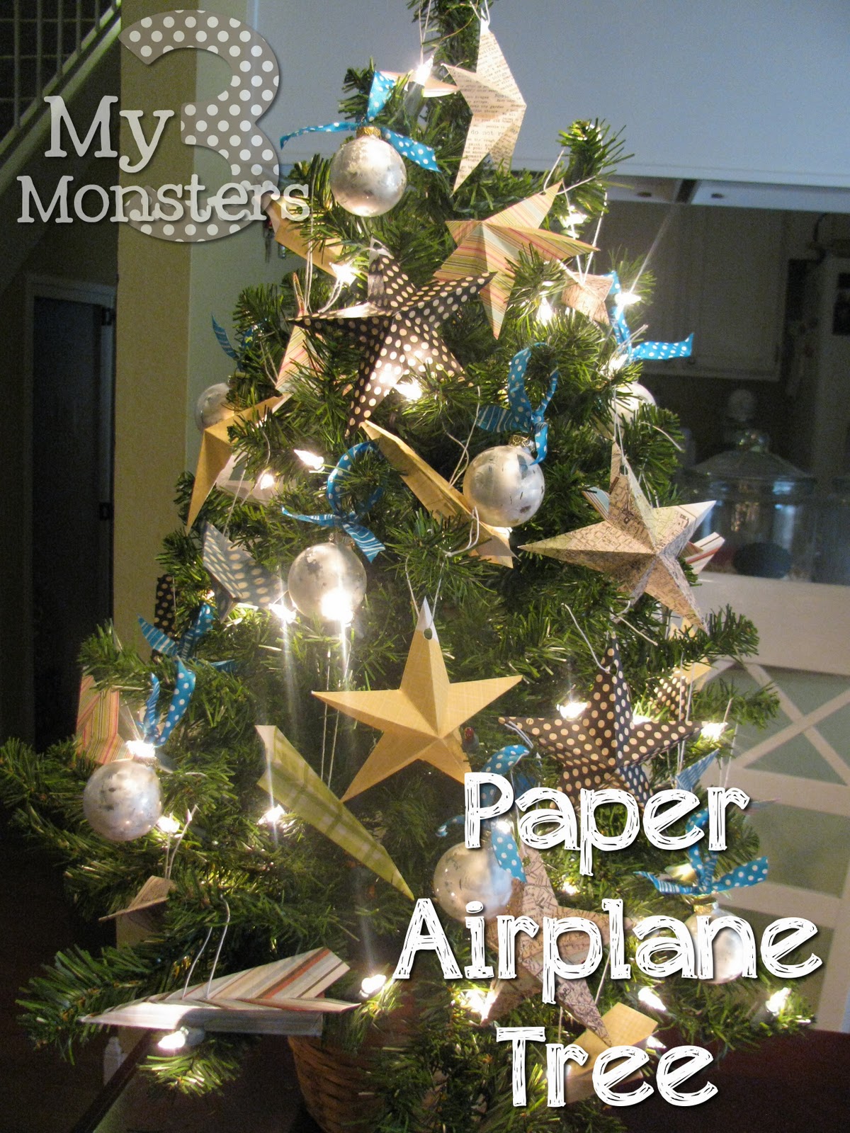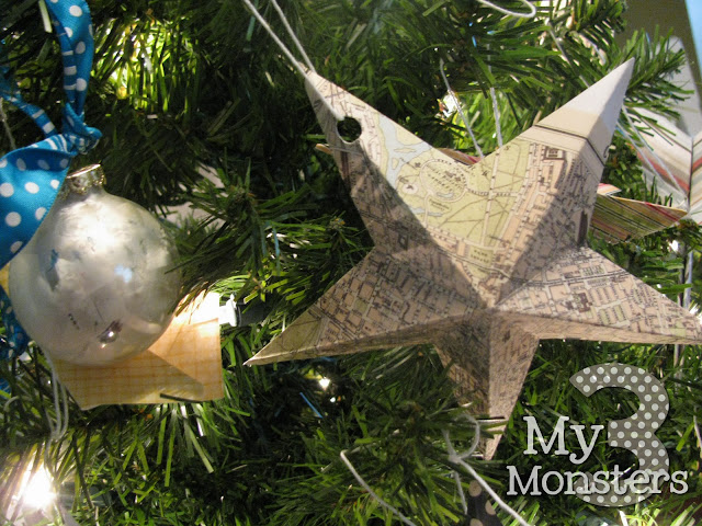 For the boys I made the stars and then folded a bunch of paper airplanes out of coordinating printed cardstock. I also had some silver and white ball ornaments that I hung up with teal polka-dot ribbon. I love the whimsical vintage-y vibe that it has with the old map paper and polka-dots. It's not super Christmas-y, but it feels festive and fun and my boys LOVE it.