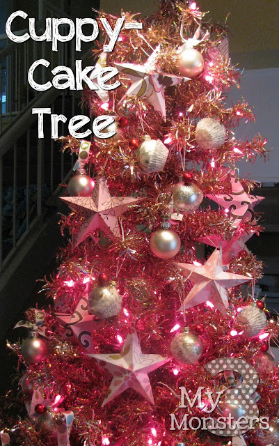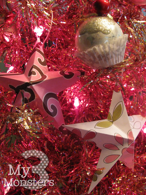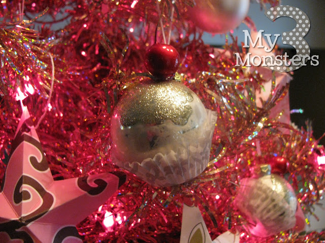 I made some more of my favorite stars out of pink and white print papers and hung some silver/white and shiny pink ball ornaments with cute girly ribbon. But the pièce de resistance are these cuppy-cake ornaments inspired by some that I saw on Pinterest a while ago.