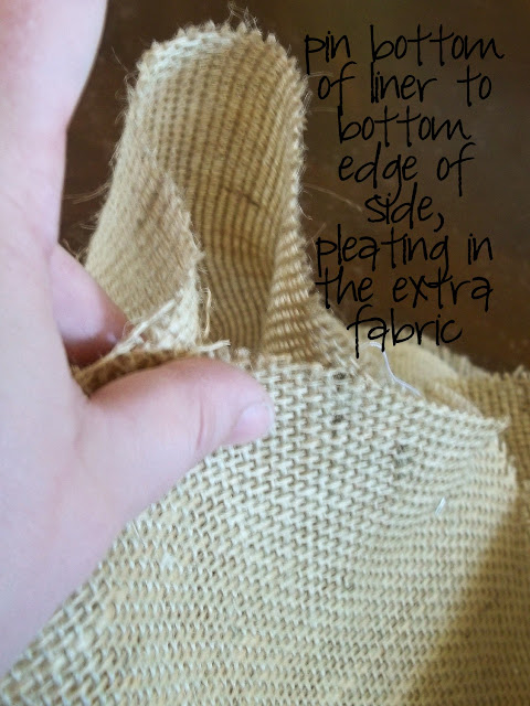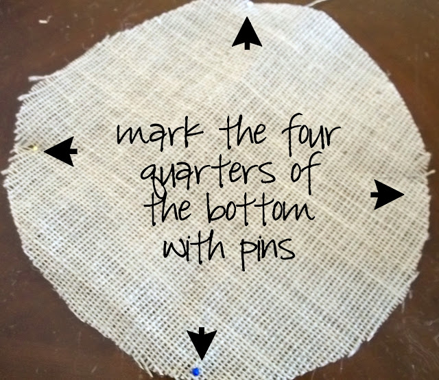 With RIGHT SIDES TOGETHER, match up the four pins around the bottom edge of your liner side fabric with the four pins at the quarters of your circle fabric. You'll have a lot of extra fabric on the liner side since the top of your basket is probably wider than the base. I just made it fit by making a large pleat in between each of the pins. I tried to take a picture of that, but it's hard to hold the fabric with one hand and the camera with the other, y'all. The important thing to remember is that this is a liner . . . for a potato basket . . . and it doesn't have to look too nice.