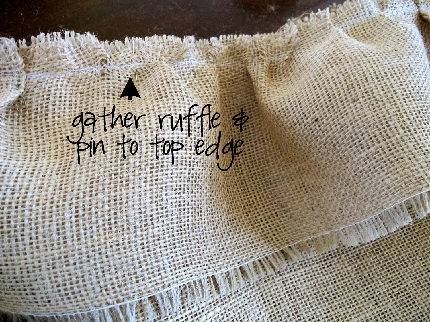 You'll now have a loop of fabric 71-ish inches around and 3 inches wide. Stitch around the raw edges with a long stitch length to gather the fabric up. When I gather fabric, I crank the tension on my machine as high as it will go and set the stitch length as long as it will go and let the machine do all the work of gathering for you. Soooo much faster! {In the picture I didn't fold my fabric in half because I thought I might like the look of a wider, unfinished ruffle, but it was really a lot cuter when folded in half.} Pin your ruffle to the WRONG SIDE of the liner side fabric and sew all around the top edge. {Don't forget to reset the stitch length and tension of your machine to normal before you sew it here!}