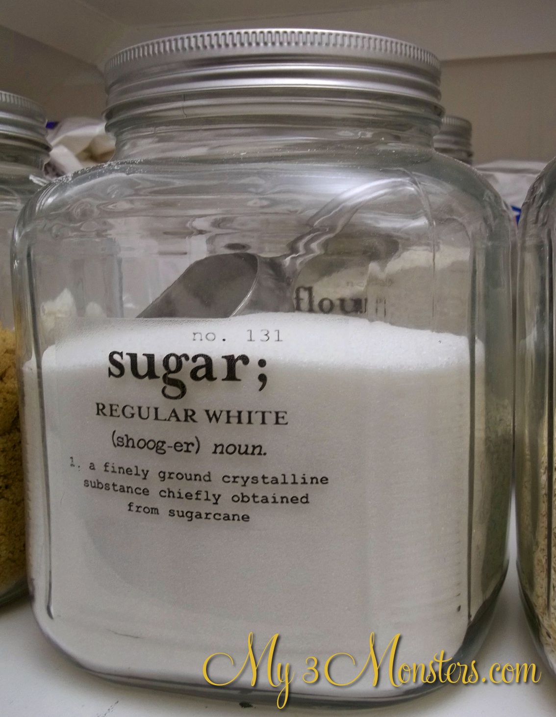 You can see in the close up how they have a translucent background -- almost like lightly frosted glass. It's hardly noticeable when the canisters are filled, but I don't mind it at all. I found the little metal scoops online a while ago and I think they add a lot to the look of the jars. {They're also very practical. And super inexpensive. Just sayin'.} I have some smaller canisters for my baking stuff. {With smaller scoops, of course.}