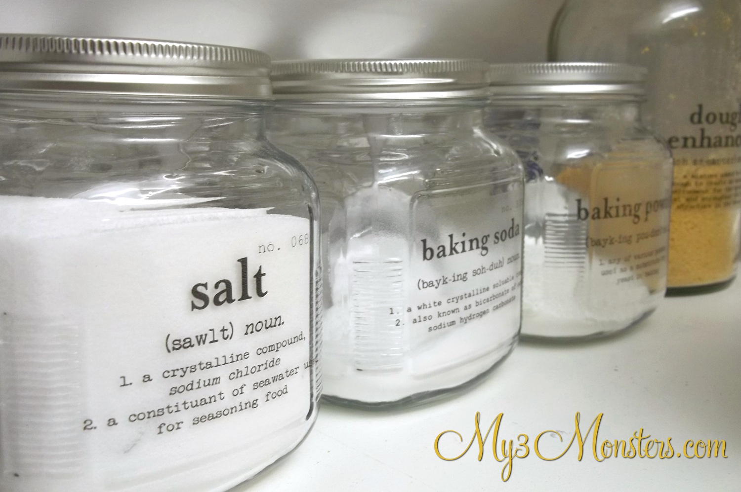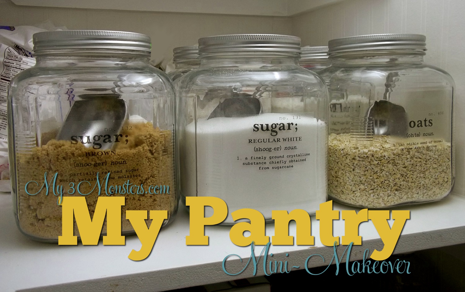 I've been giving my kitchen a mini-makeover this week, so I decided to let my pantry get in on the act. Now, I feel I must tell you that my pantry is not swoon-worthy like this one {or several others I've seen in blog-land}, but I have made a few {subtle} improvements. Just don't set your expectations too high, alright? Alrighty then . . . I've had these glass canisters in here for quite a while and I love them. They are pretty inexpensive {$3-$6 at WalMart} and they have nice wide mouths so it's easy to get stuff out of 'em. I was getting tired of the kids calling to me, "Mom, which one of these is flour and which is oats?" so I decided they needed labels. {OK, my kids are smarter than that, but you know what I mean.} After searching Pinterest for inspiration, I came upon this most fabulously beautiful idea at The Painted Hive.