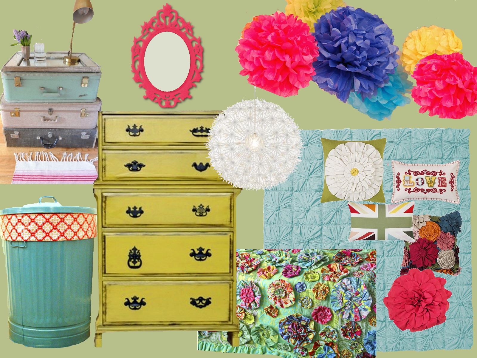 Ahhhhhh . . . tomorrow marks the beginning of Spring Break round these parts. I'm looking forward to a few days of sleeping in and hangin' with my kiddos. I'll also be finishing up the spring cleaning that I started last week. I pulled out my kitchen appliances and cleaned every nook and cranny. Now I'm going to give my cabinets a sanding and a fresh coat of paint. And repaint the half bathroom, the coffee table, and the dresser next to my front door. Since spring is so strong in the air and I'm in the mood to freshen things up, I gave Sis's room a virtual makeover tonight. She's tired of the pink and brown {and don't tell Brent, but so am I} so I came up with a plan to make it more "teenage girl-y". Here's the plan: