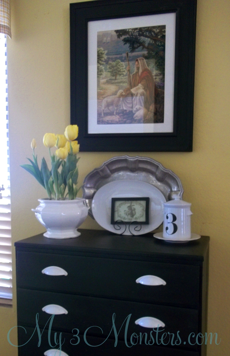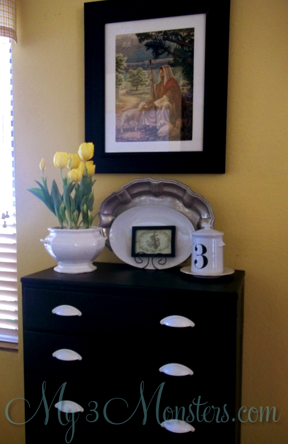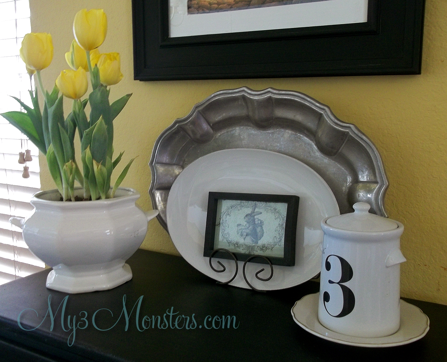 I love the black and white so much more. And the yellow tulips in the white tureen really pop on it. It makes me happy every time I walk by {a thousand times a day}.