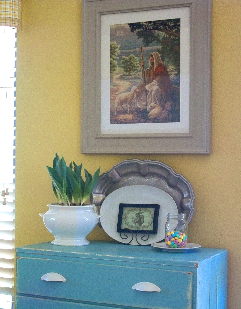 My tulips are blooming! It's a little earlier than I had hoped, but I'm really excited. I was walking past them the other day and just caught it out of the corner of my eye. A little yellow bloom. Not just one. Like three or four! And they just keep getting prettier. I also painted the dresser this weekend so here's a little BEFORE: