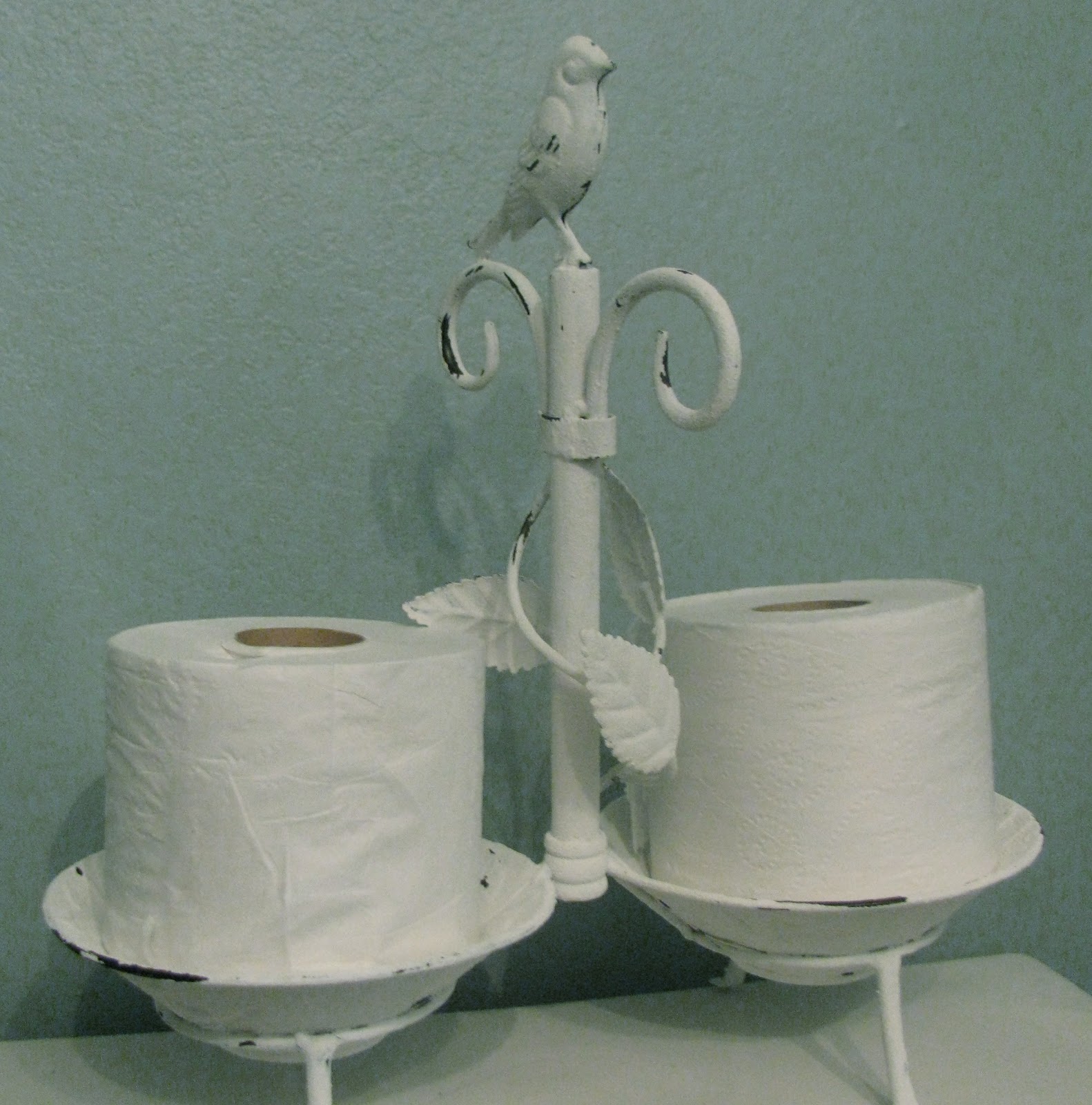 I had this metal dish thingy in my garage. I picked it up somewhere for probably very little money and then never found a use for it. I painted it white with my chalky paint from the kitchen and distressed it. The bowls on it are the perfect size to hold extra rolls of toilet paper.