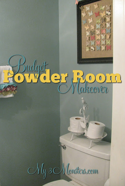 Here's one more look at how all the colors come together. I love the butterfly specimen art and ruffly hand towels on the turquoise walls.