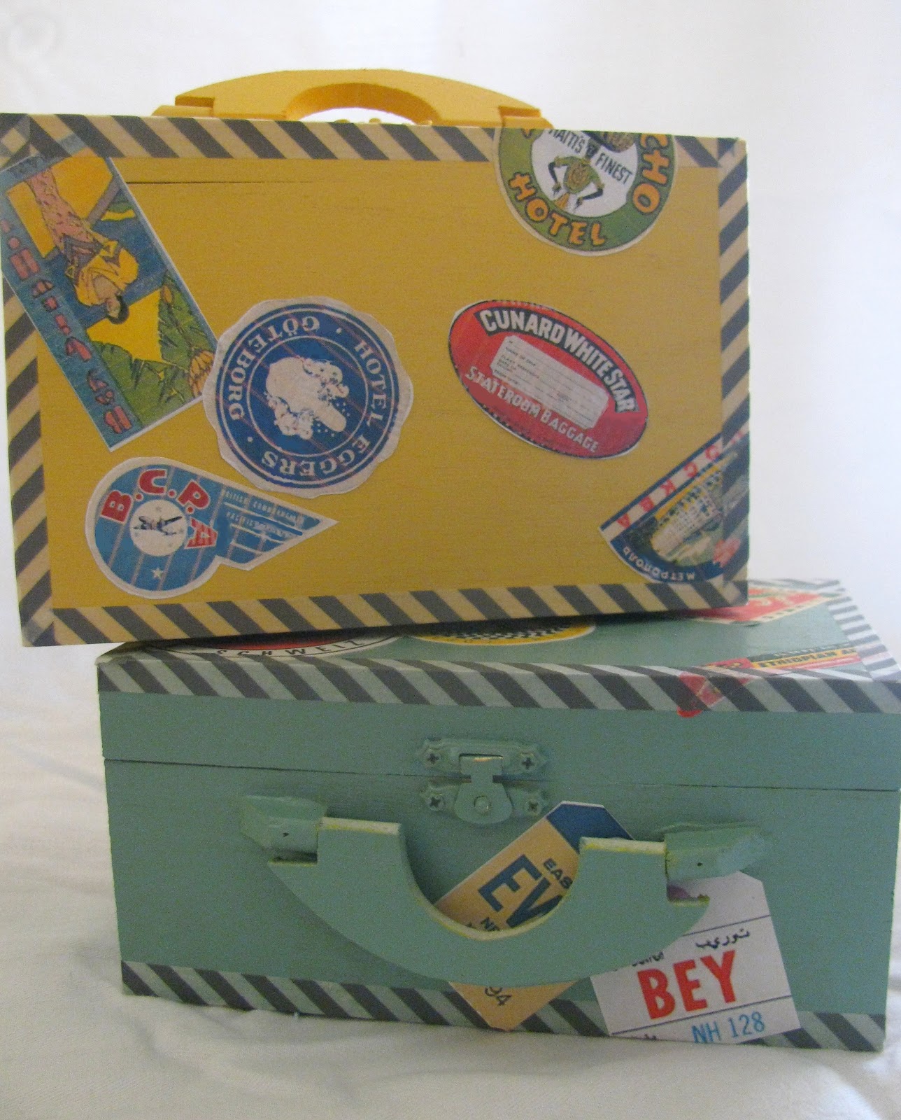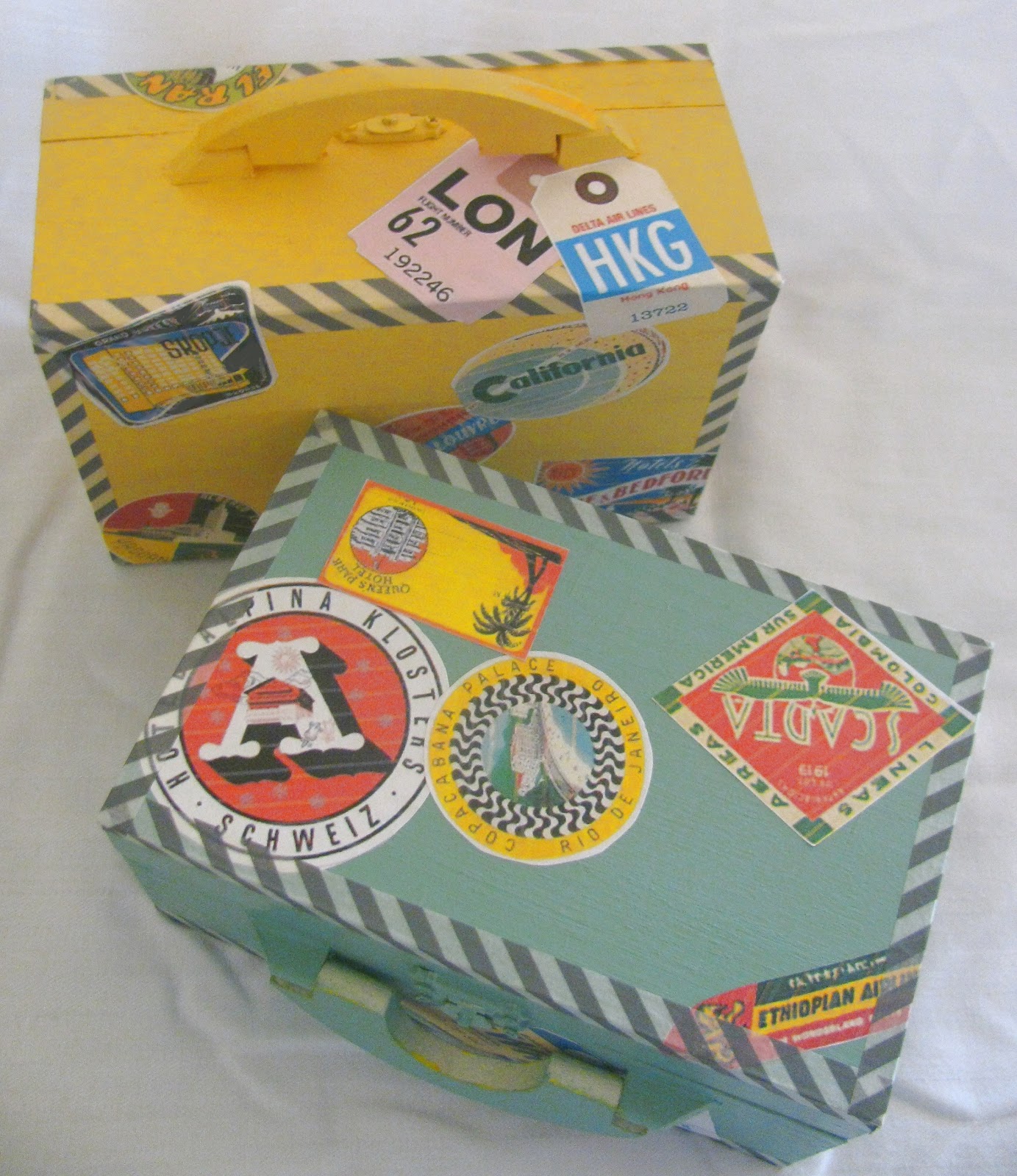 I found some vintage travel sticker digital images like this one on etsy and printed them on 8.5x11 full sheet mailing labels. Once you cut them out they work great as stickers for the mini-luggage boxes. Looking at these pictures it is clear I should have used a higher quality printer setting on the stickers. It makes them look rough and aged, I guess. If you're feeling really crafty you could paint a coat of Mod Podge on top to help protect the stickers. Have you seen the antique glaze Mod Podge they have now? That would be really cool.