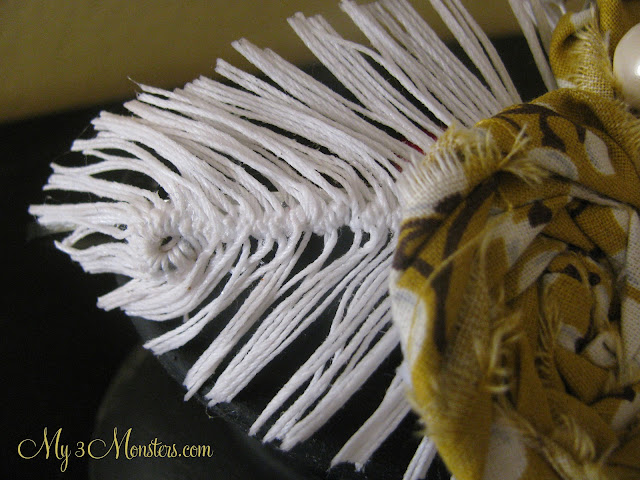 I wanted to make something totally unique for her -- we have a ton of rosette headbands here. I remembered seeing these really cool string feathers over at Blue Sky Confections a few weeks ago. I looked and found that tutorial and this other one at Twigg Studios that is only very slightly different. I had everything but the liquid starch in my craft stash so I whipped one up and brushed it with Mod Podge to stiffen it up. That came out a little bit clumpy-looking. I want to make another one using starch to see if it will turn out better, but this one will do for now.
