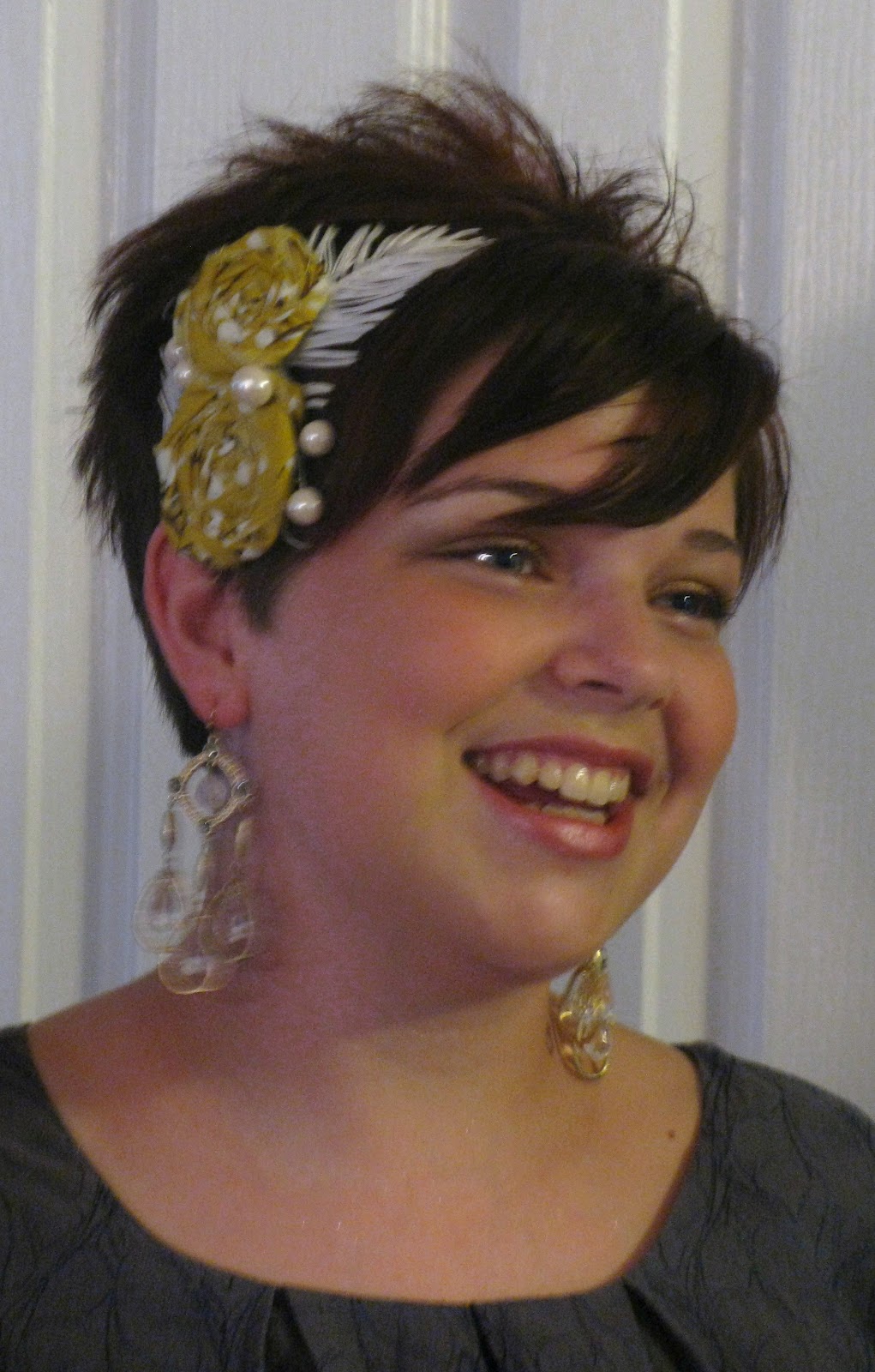 Just one last cute little surprise for Sis for the dance tonight. We played around with her hair yesterday and just didn't love anything we came up with. Her hair is cutest styled the way she normally does it. So I was thinking that since we couldn't do anything fancy with her hair, maybe we could put something cute in it. I LOVE a cute pixie cut with a funky headband. That's probably my most favorite thing. I wish I could pull it off. I can't, but Sis can!