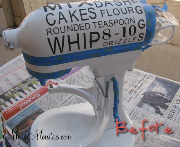 You can see in the picture above that I undid a couple of screws -- one to remove the piece at the back that covers the wires and motor and stuff, two that held the metal band that says KitchenAid on, and two that held the bowl clip on the front. Then I cleaned the mixer really, really well, removing cake better splashes from several years ago, I'm sure. I also taped up the areas that I didn't want to get painted. I used a ziploc bag to cover the cord and then taped it up to cover the wires and motor and stuff. Before I started spraying, I also made sure all the corners of the vinyl letters were pressed down really good.
