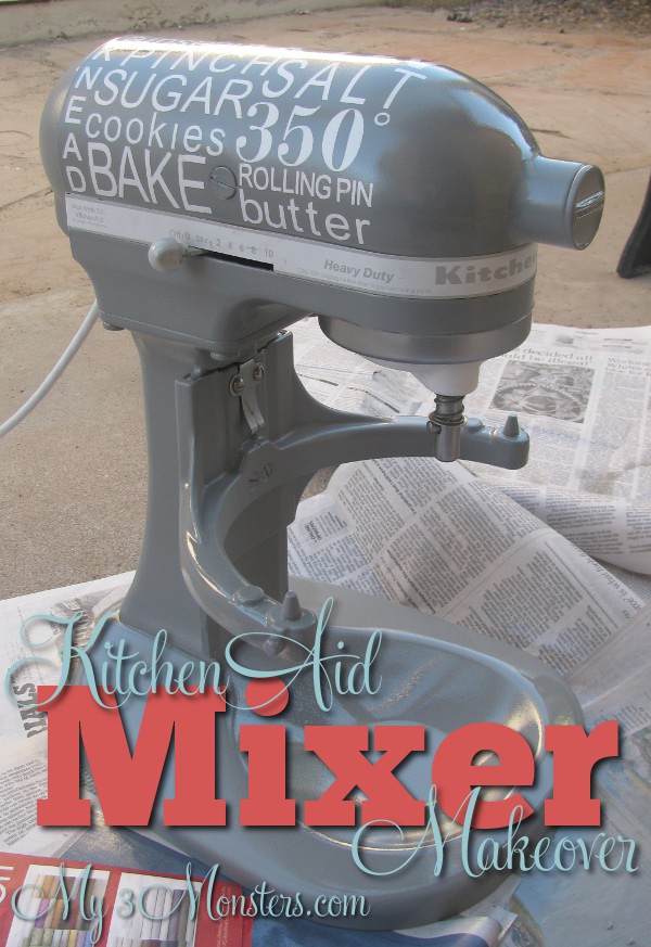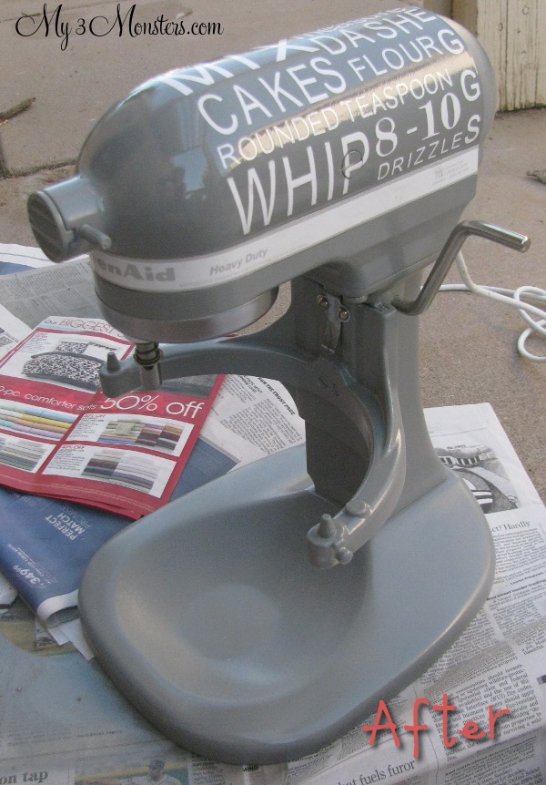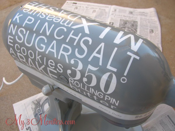 Using a really good Rustoleum spray paint, I sprayed several light coats of gray over the entire mixer. If you have the same model I do with the bowl that raises up, make sure you spray it with the bowl in the up AND down positions or else you'll be sad later when you use it. I let the paint dry for about an hour before peeling off the vinyl lettering. Despite my prepping, some of the letters were a tiny bit peel-y so I had a bit of overspray (or is it underspray) on a few letters. I was able to use my fingernail to gently scrape it off so the design looked perfect.